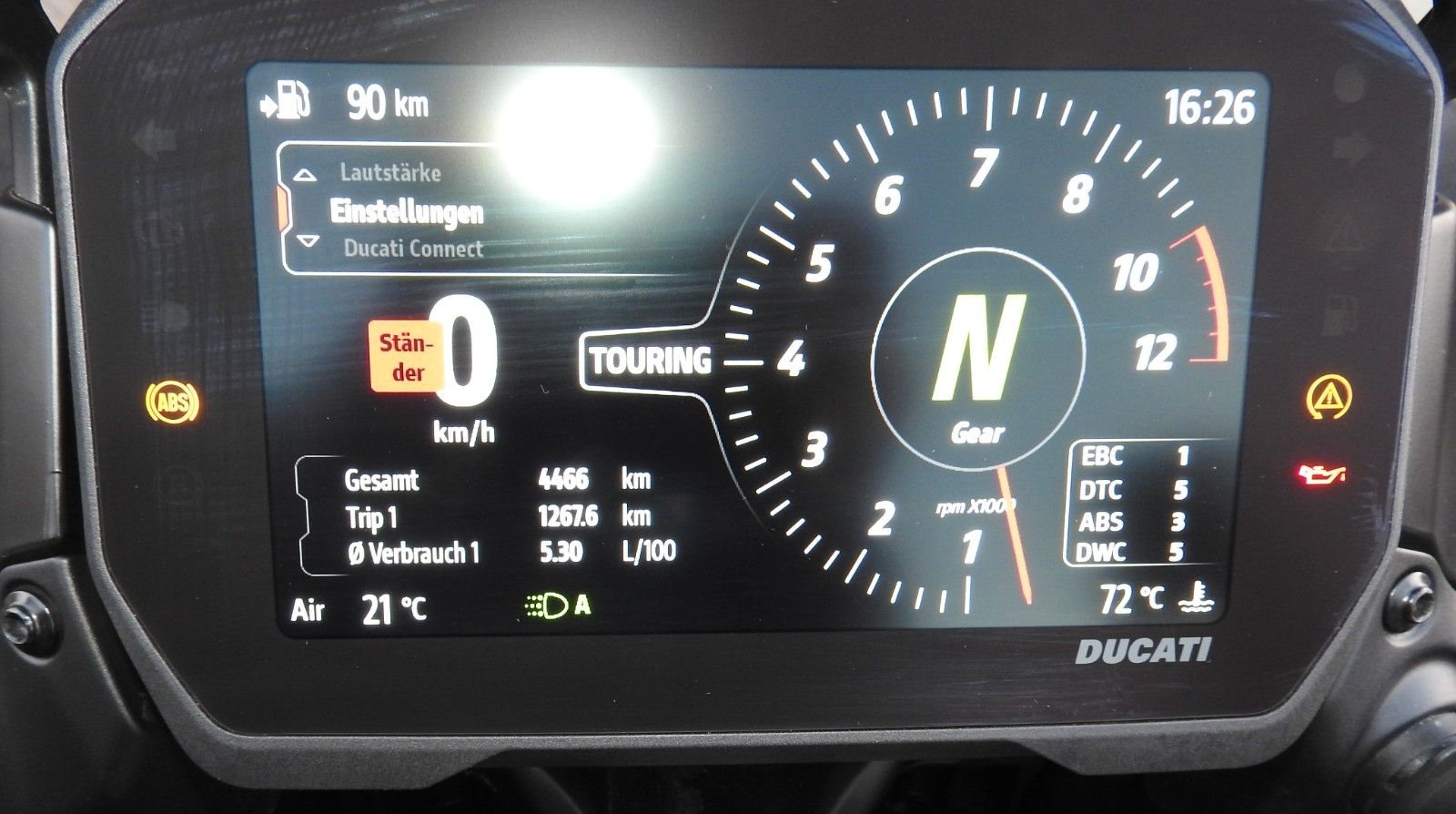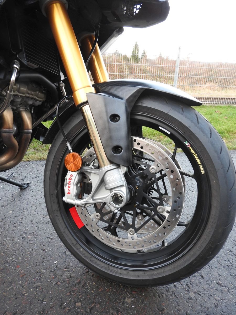 Serienausstattung: Elektronisch einstellbare Öhlins Smart EC 2.0 Federung, Ducati Quick Shift, Abstandstempomat, Hands-Free, beleuchtete Bedienelemente, 6,5-Zoll-TFT-Farbdisplay mit Ducati Connect und Karten-Navigation, Voll-LED-Scheinwerfer, Vorderer Kotflügel und Schnabel aus Carbon, Akrapovic Endschalldämpfer.