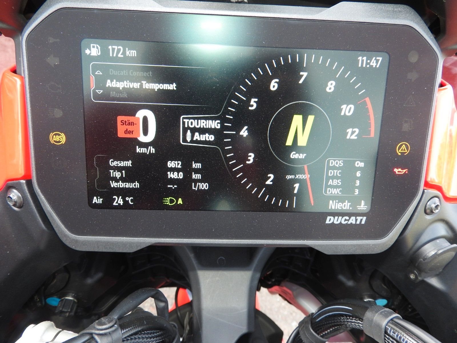 Serienausstattung: Ducati Skyhook Suspension, Minimum Preload System, Ducati Quick Shift, Tempomat, Hands-Free, beleuchtete Bedienelemente, 6,5-Zoll-TFT-Farbdisplay mit Ducati Connect und Karten-Navigation, Voll-LED-Scheinwerfer.