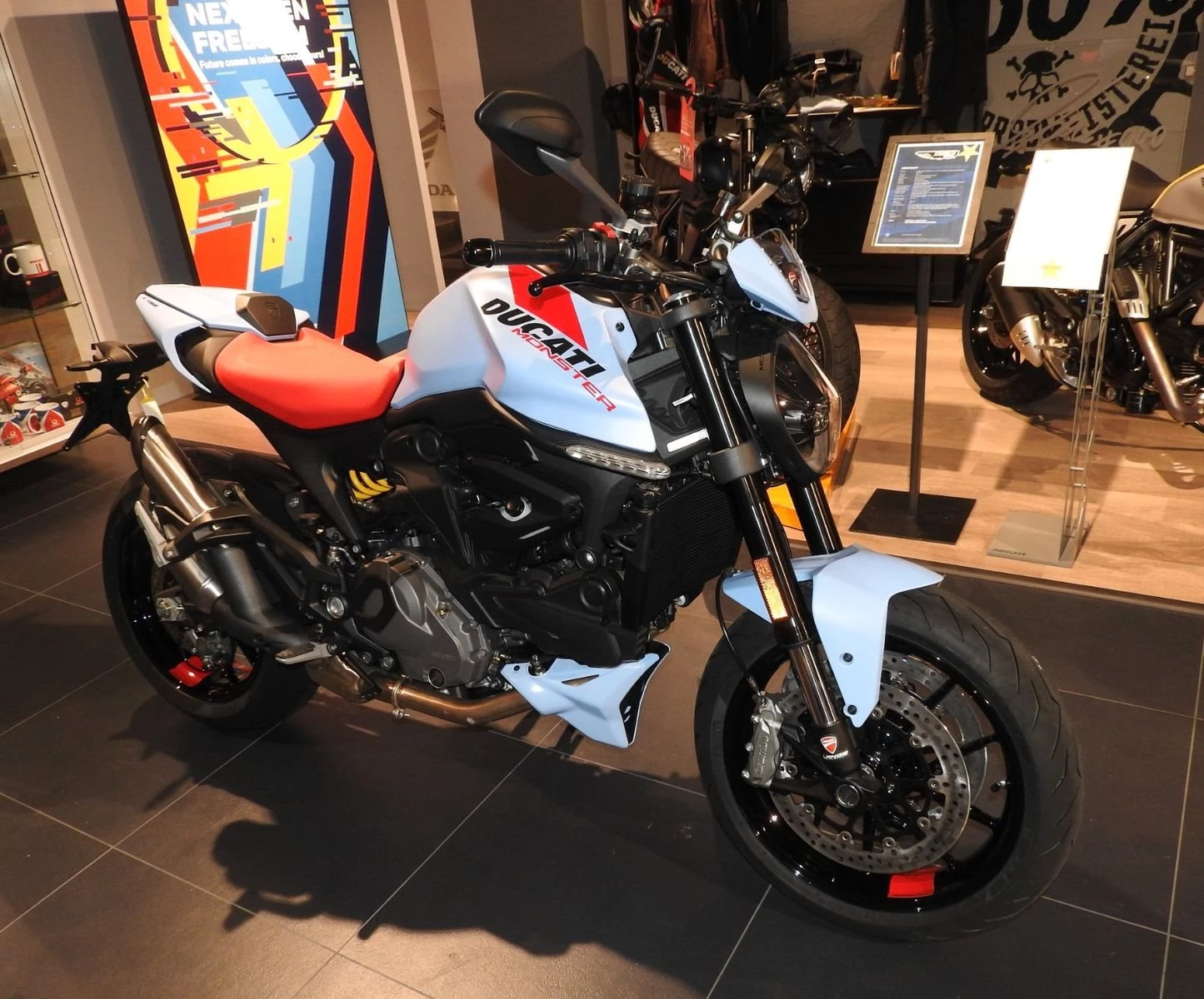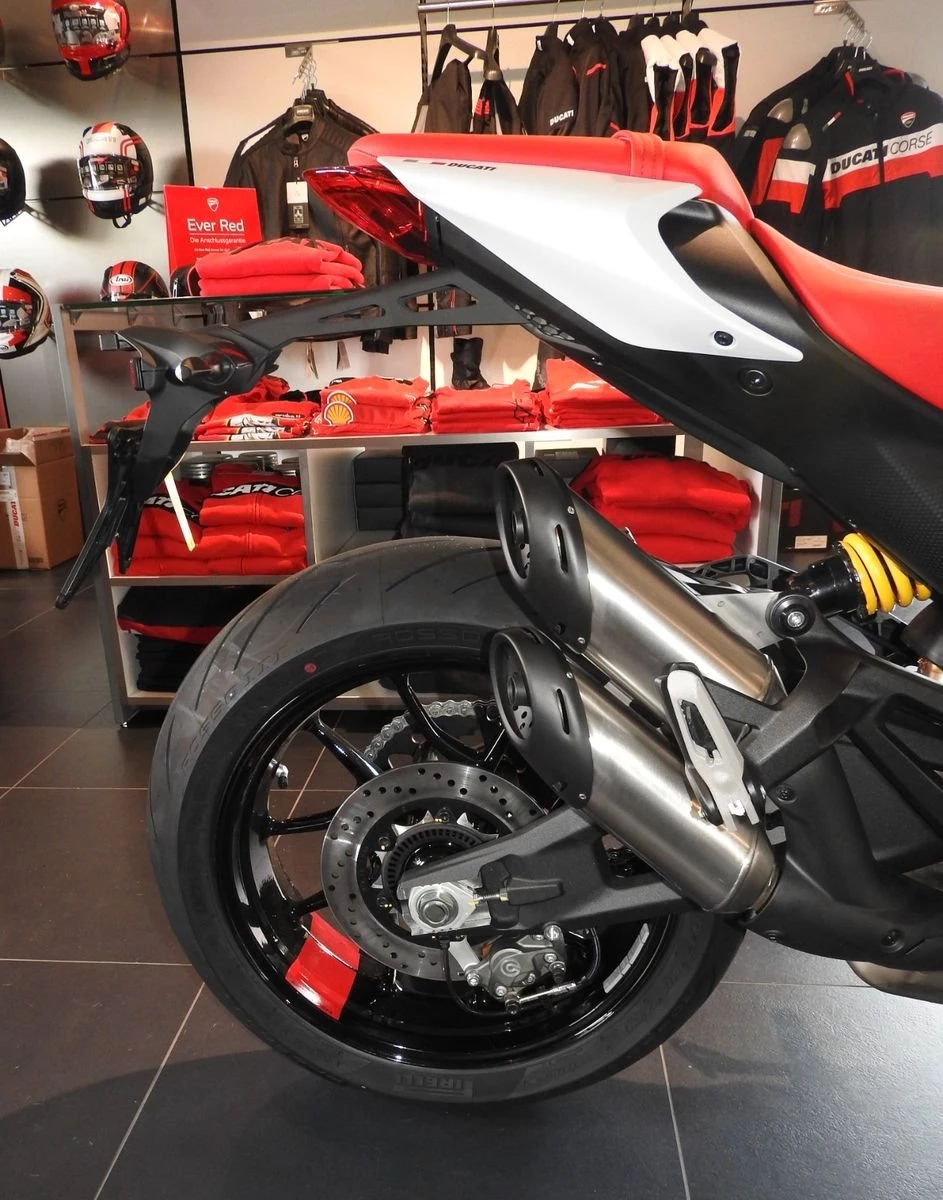 Die Monster ist mit dem Euro-5-zugelassenen 937 cm Testastretta 11°-Motor mit desmodromischer Steuerung ausgestattet. Mit einer Leistung von 111 PS bei 9250 U/min ist der Motor sanft und kontrolliert bei niedrigen Drehzahlen, um den Stadtverkehr ohne Zögern zu bewältigen, aber auch dynamisch bei mittleren und hohen Drehzahlen, für eine mitreißende Leistung in jeder Situation. Sein geringes Gewicht trägt zur Leichtigkeit des Motorrads bei und erhöht die Fahrbarkeit.