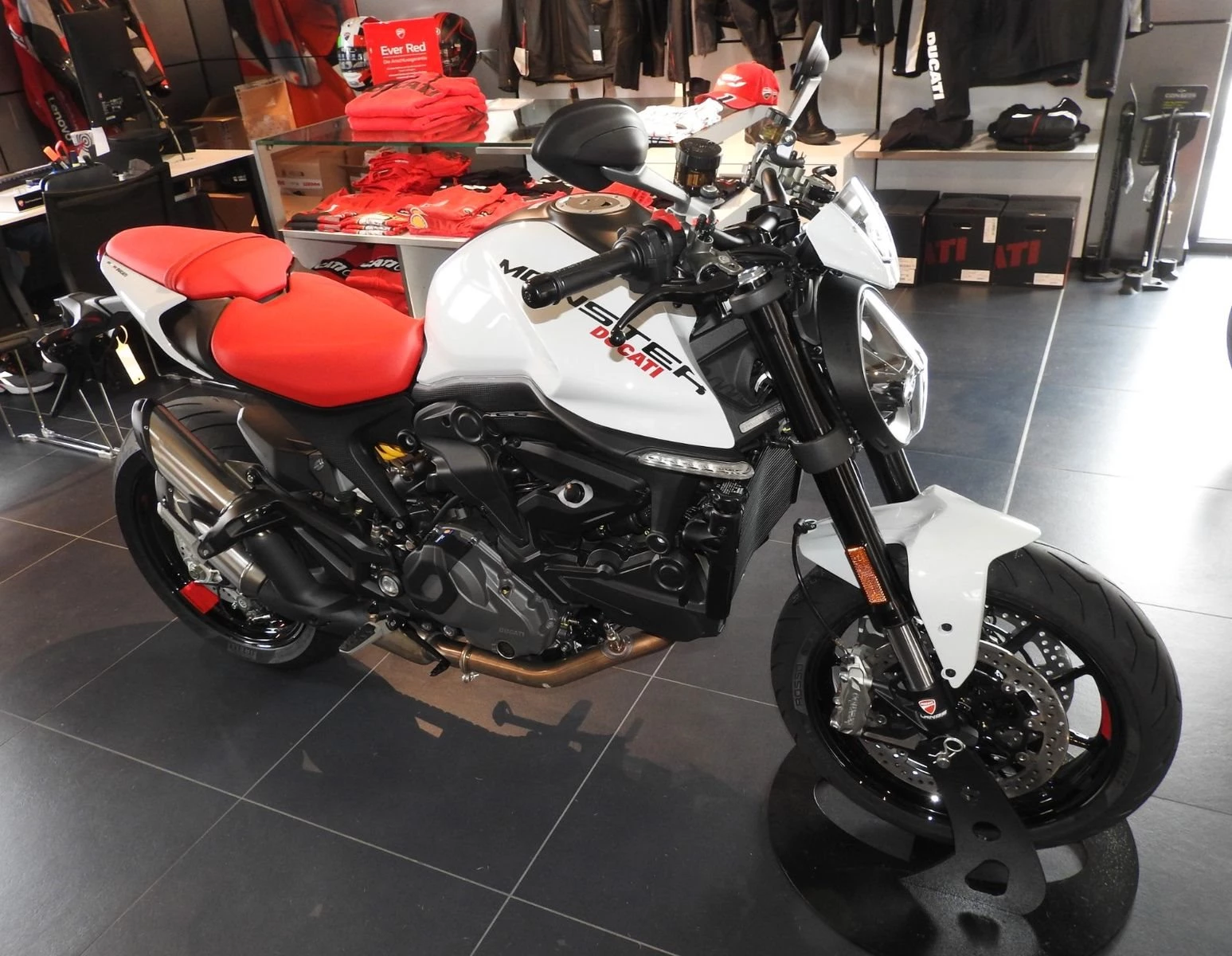 Zum Verkauf steht eine DUCATI Monster+ (Neufahrzeug, Iceberg White).